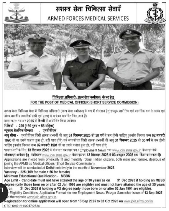 Armed Force Medical Service AFMS Released a notification on official website for the recruitment of Medical Officer. This Recruitment Has 225 Positions Indian Army AFMS Application Form has started on 13 September 2025 & the candidates can apply till 03 October 2025. Candidates must check the complete details for Army AFMS MO Recruitment 2025.