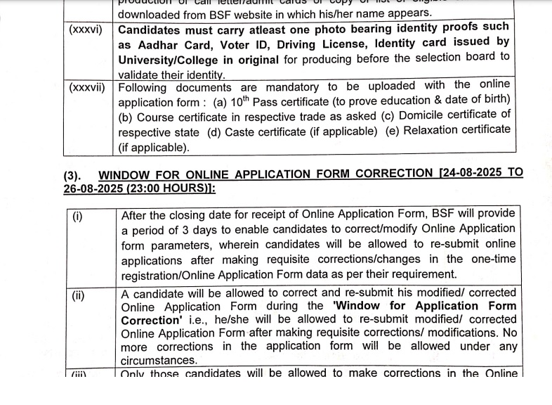 | Border Security Force (BSF), | Released Correction / Edit Form on official website for the recruitment of Constable Tradesman Post. This recruitment is for 3588 positions. BSF Application Correction Form will start from 24 August 2025 & the candidates can apply till 26 August 2025. Candidates must check the complete details for BSF Constable Tradesman Correction / Edit Form 2025 |