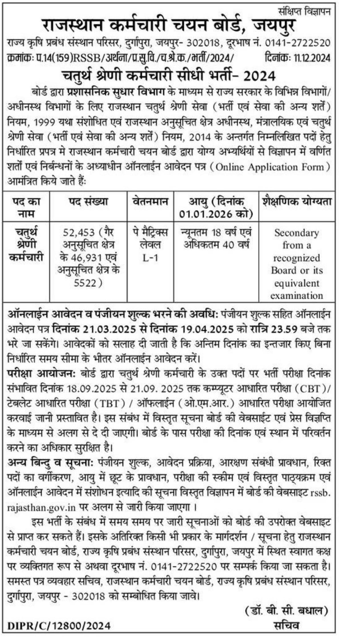 | Rajasthan Staff Selection Board (RSSB) | Released the Admit Card on its official website for the 4th Class Employee Group-D. The exam will be conducted on 19, 20 & 21 September 2025, and the last date to submit the application form was 19 April 2025. Candidates can check their Exam Date / Admit Card Soon using their Enrollment Number, Registration Number, or Date of Birth by logging into the portal. |