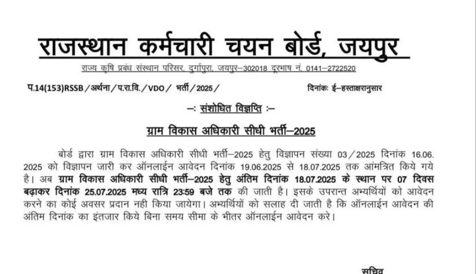 Notification on official website for the recruitment of Village Development Officer VDO. This recruitment is for 850 positions. RSSB Application Form has started on 18 June 2025 & the candidates can apply till the 25 July 2025 (Extended). Minimum age required is 18 Years & The Maximum Age Is 40 Years as on 01 January 2026. Candidates must check the complete details for RSSB Village Development Officer VDO Recruitment 2025. which has given below. |