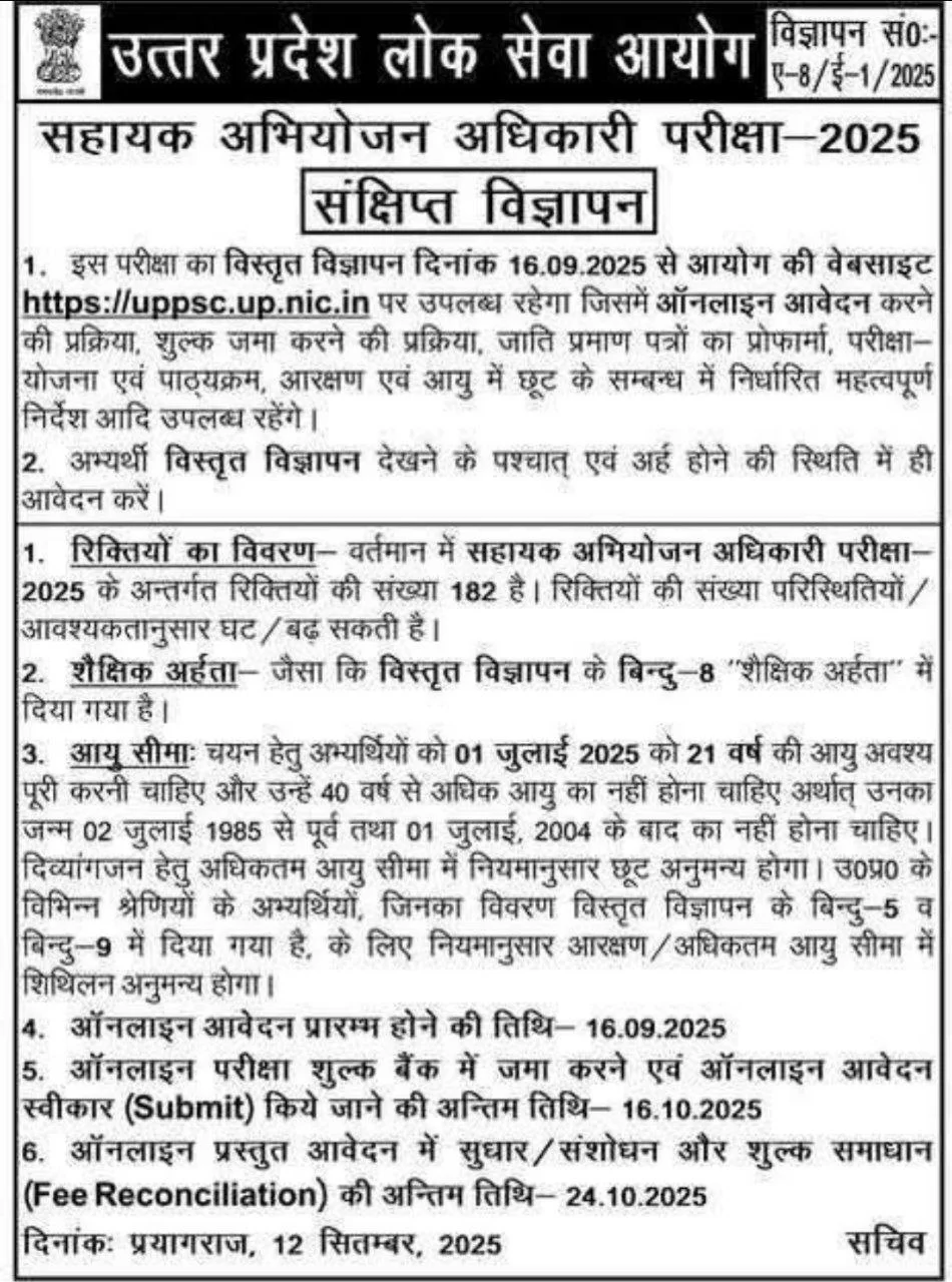 Uttar Pradesh Public Service Commission (UPPSC) Released notification on official website for the recruitment of Assistant Prosecution Officer (APO) Post. This recruitment is for 182 positions. UPPSC Application Form has started on 16 September 2025 & the candidates can apply till the 16 October 2025. Candidates must check the complete details for UPPSC APO Recruitment 2025