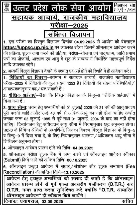 Uttar Pradesh Public Service Commission (UPPSC)  Released a notification on official website for the recruitment of Assistant Professor Post. This recruitment is for 1253 positions. UPPSC Application Form has started on 04 September 2025 & the candidates can apply till the 06 October 2025. The Minimum age required is 21 Years & The Maximum Age Is 40 Years as on 01 July 2025. Candidates must check the complete details for UPPSC Assistant Professor Recruitment 2025